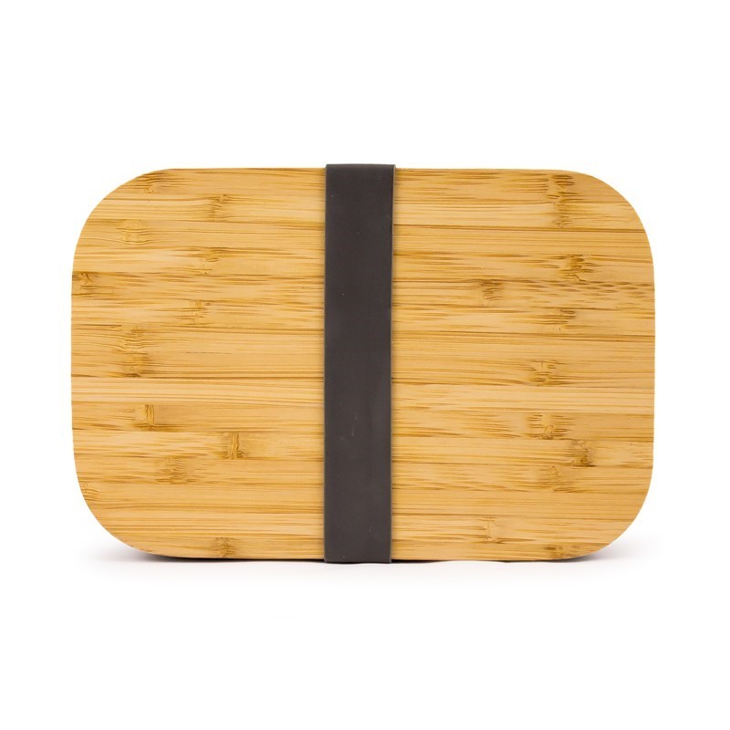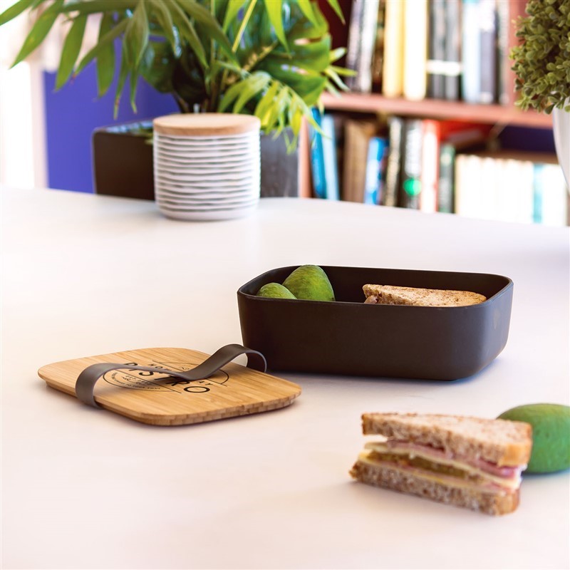 Introducing the Bamboo Fiber Lunch Box, a sustainable option for your lunchtime needs. Made from eco-friendly bamboo fiber, it features a sleek dark grey/wood color combination and a secure silicone band closure. Dishwasher safe and measuring 189 x 127 x 60mm, it's perfect for on-the-go lunches or outdoor activities. Packaged in an eco kraft box, it's also a great gift option.