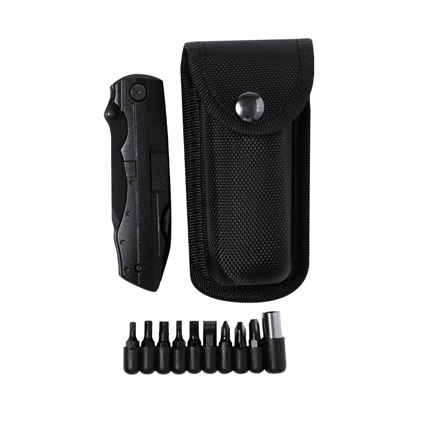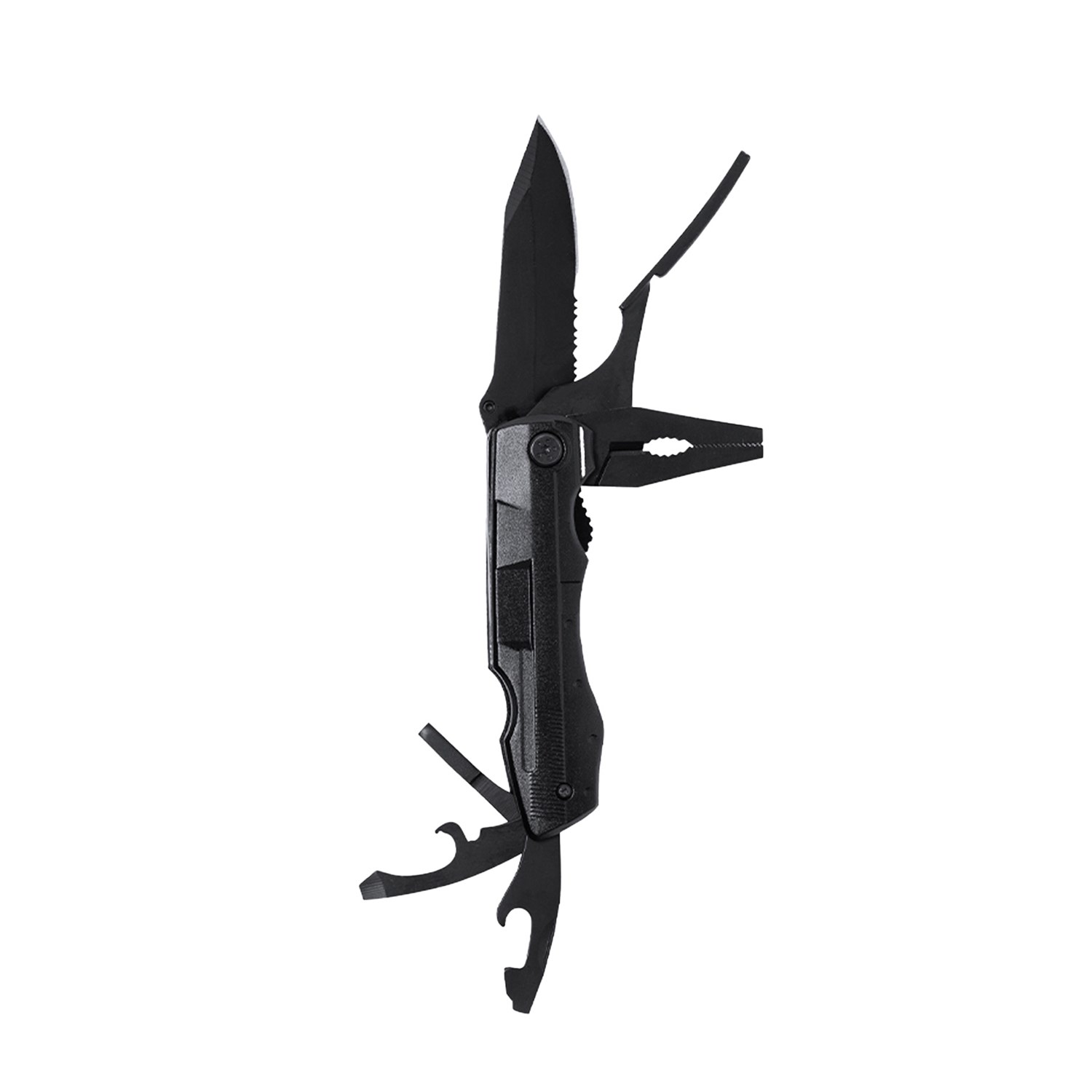 Includes 10 integrated functions such as a multi-head screwdriver, smooth and serrated blades, bottle and can openers, and pliers with wire cutter—making it a versatile all-in-one tool for outdoor, travel, or general use.