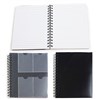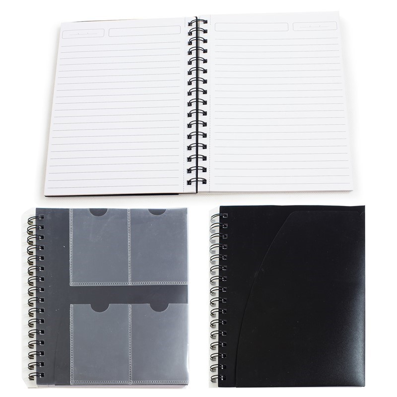 This A5 executive note pad features a durable polypropylene cover and spiral binding for ease of use. It comes with 60 sheets (120 lined pages) of high-quality paper, along with 4 business card sleeves and a document sleeve for added convenience. Available in black and white.