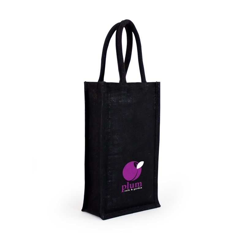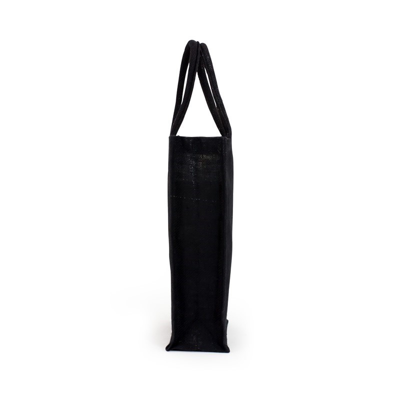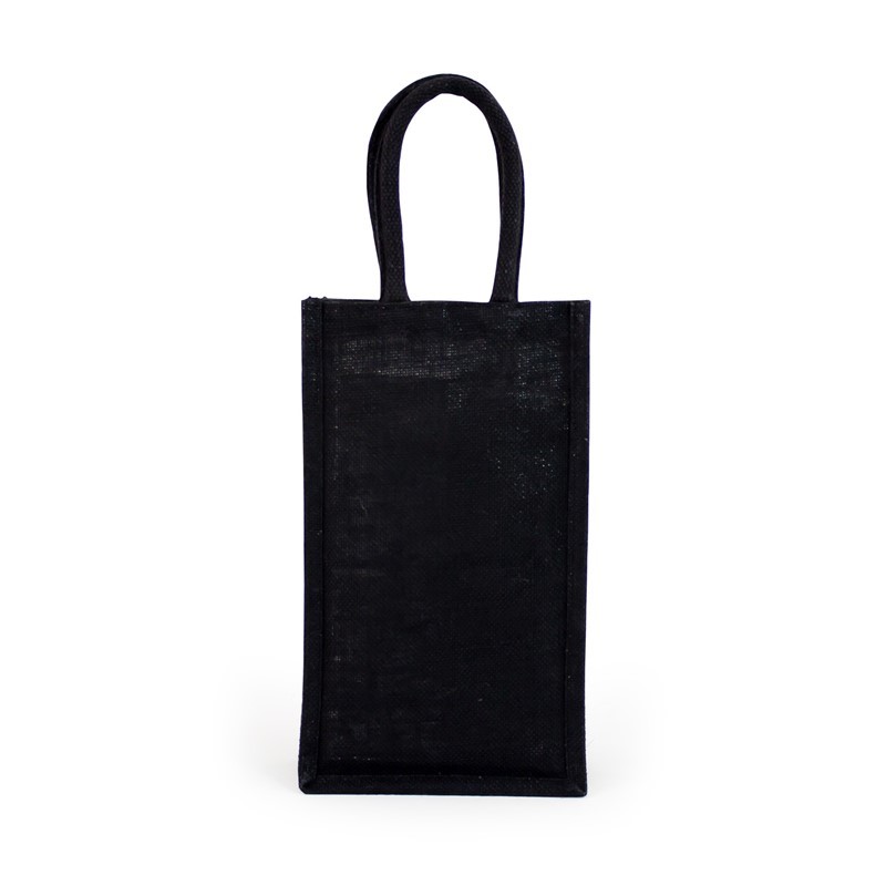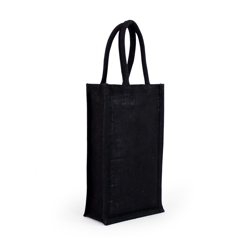 Black jute wine bag with laminated inner, with woven rope carry handles.