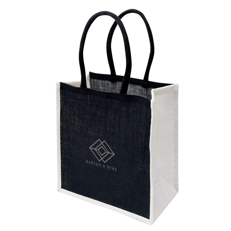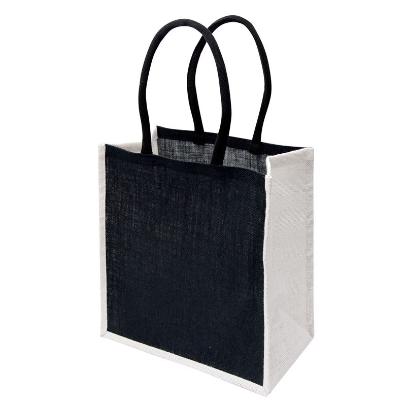 Black and white contrast jute bag with laminated inner, with black cotton rope handles.