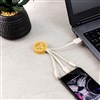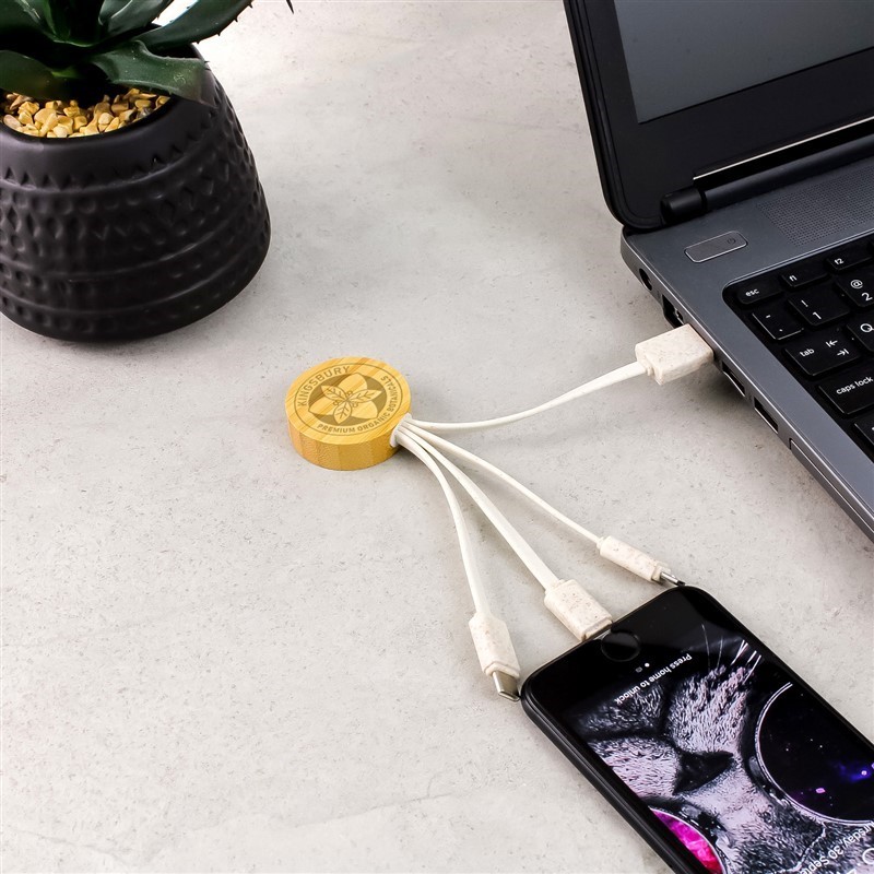 The Luna Charging Cable is a stylish and eco-friendly 3-in-1 charging cable that features natural lines and is made from sustainable materials including bamboo and wheat straw. With a wide printing area, the Luna cable is perfect for displaying your logo or branding message. It comes with a USB connector cable, a micro USB, a lightning connector and a type C connector, making it compatible with most smartphones and electronic devices. The Luna Charging Cable is especially designed for laser engraving and comes presented in an individual bag.