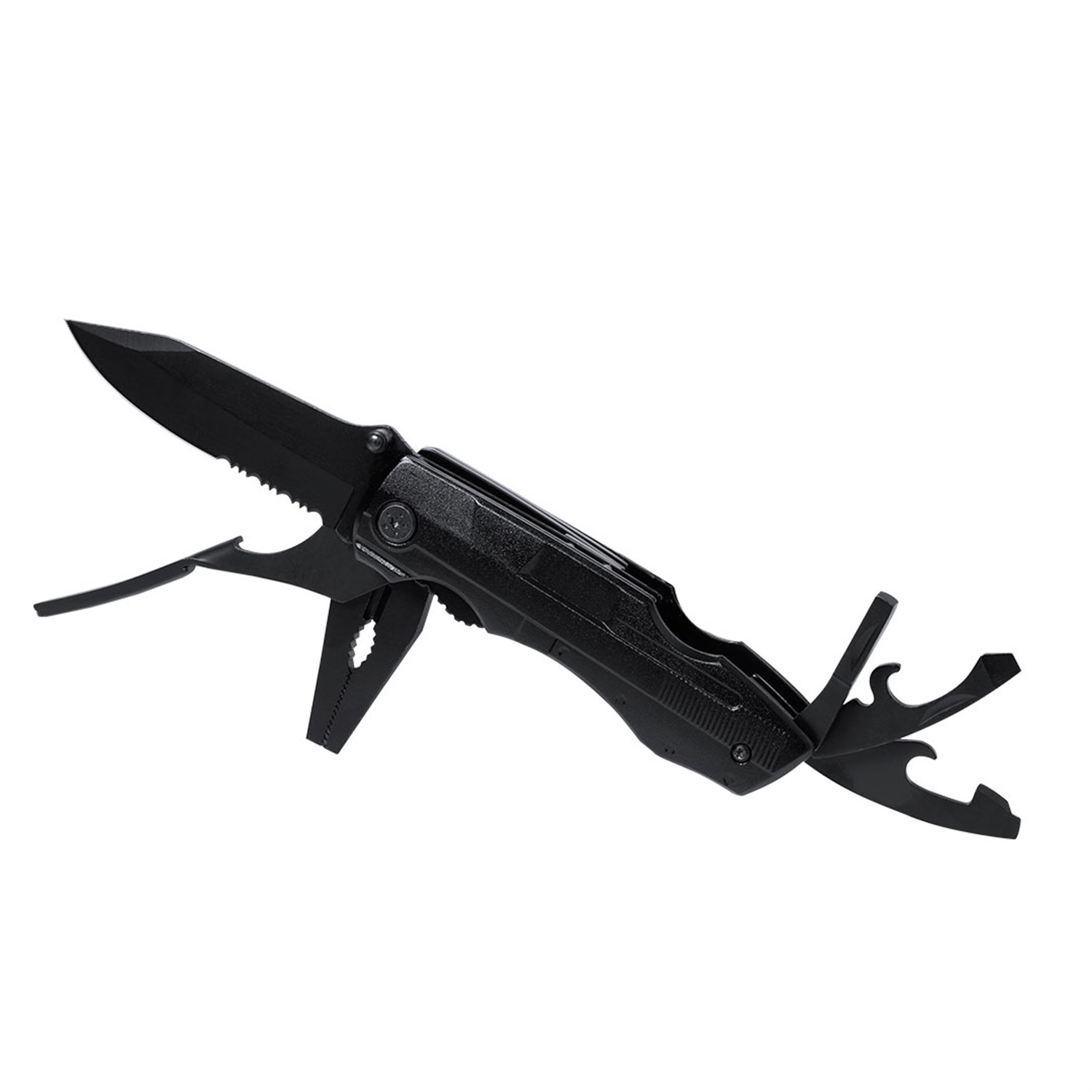 Includes 10 integrated functions such as a multi-head screwdriver, smooth and serrated blades, bottle and can openers, and pliers with wire cutter—making it a versatile all-in-one tool for outdoor, travel, or general use.