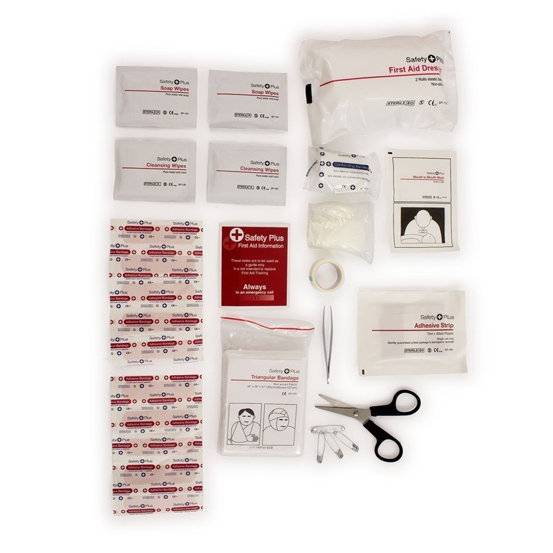The ideal First Aid Kits kit for small injuries. It contains the most frequently used plaster and dressing materials for travel, business, home and do-it-yourself activities. Packed in a smooth, coated fabric bag with belt clip. Contents: 1 x PVC Bag, 1 x triangular bandage, 1 x elastic bandage, 1 x adhesive tape roll, 4 x safety pins, 1 x scissors, 1 x tweezers, 2 x soap wipe, 2 x saline wipe, 10 x band aid strips, 1 x pair latex Gloves, 1 x mouth-to-mouth mask, 1 x conforming bandage with pad, 1 x First Aid Kits notes.